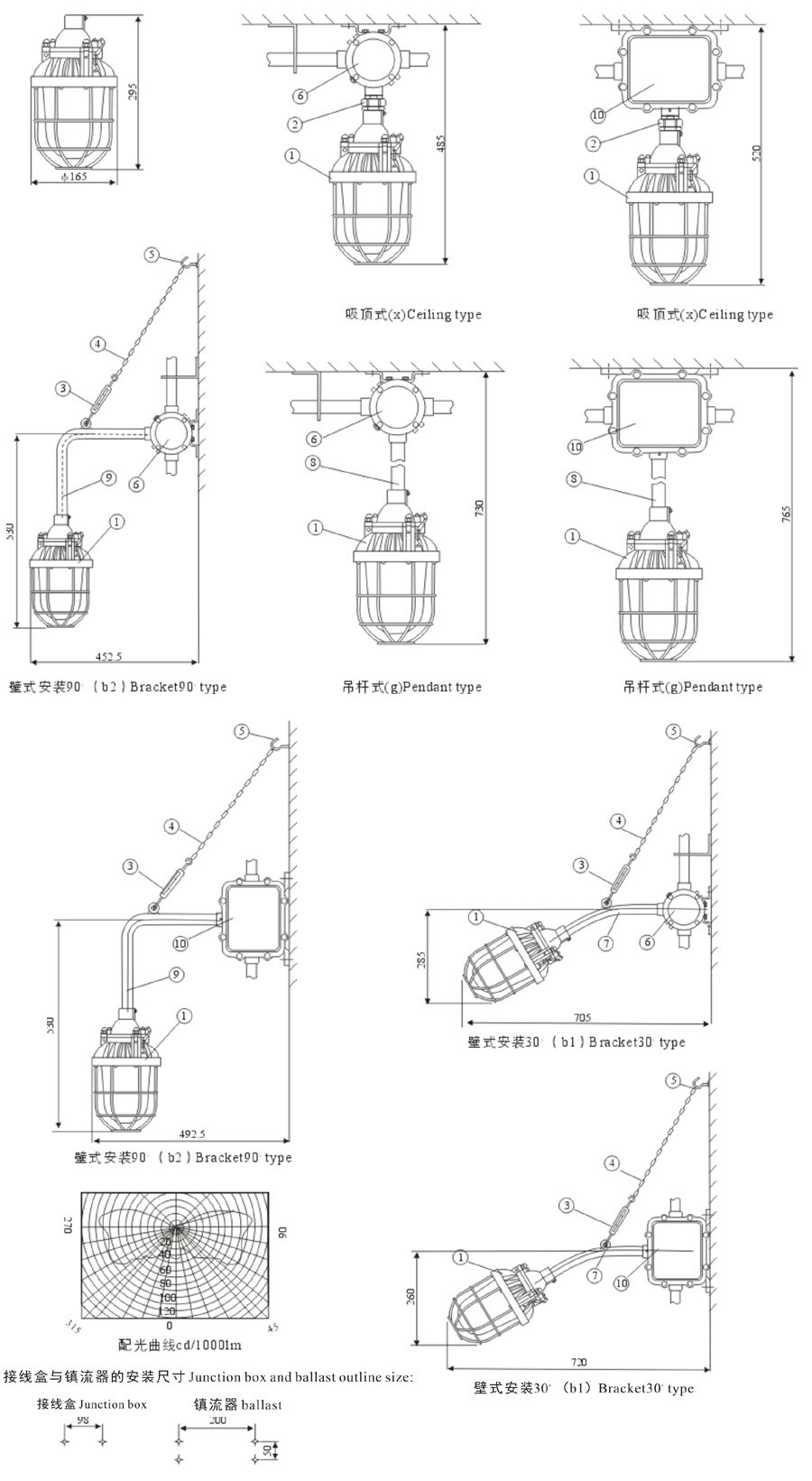 1、按產品型號說明逐條選擇,例:需配用光源為金鹵燈100W、吊桿式安裝、配接線盒、則產品型號為DCG200-L100gH;